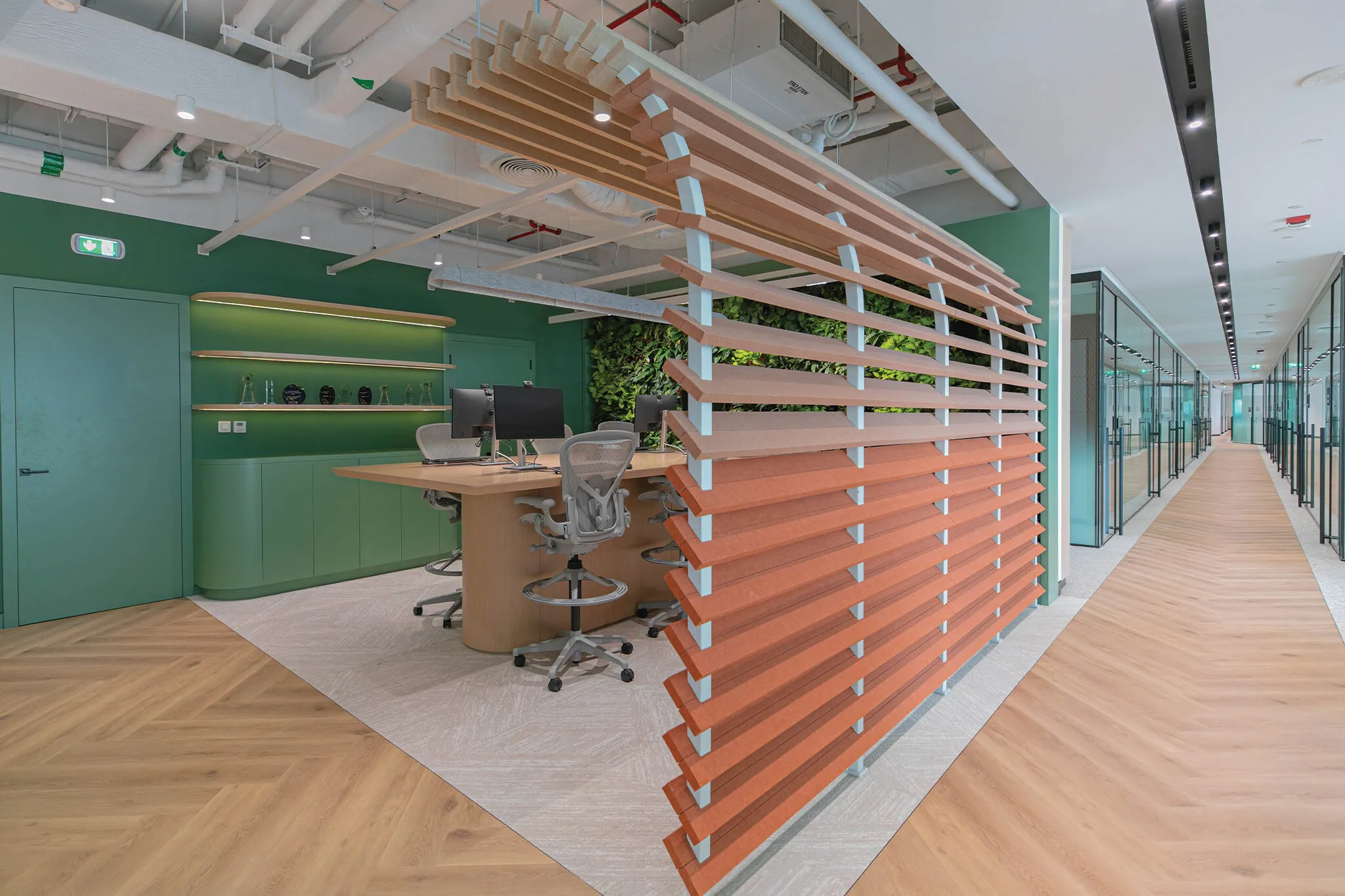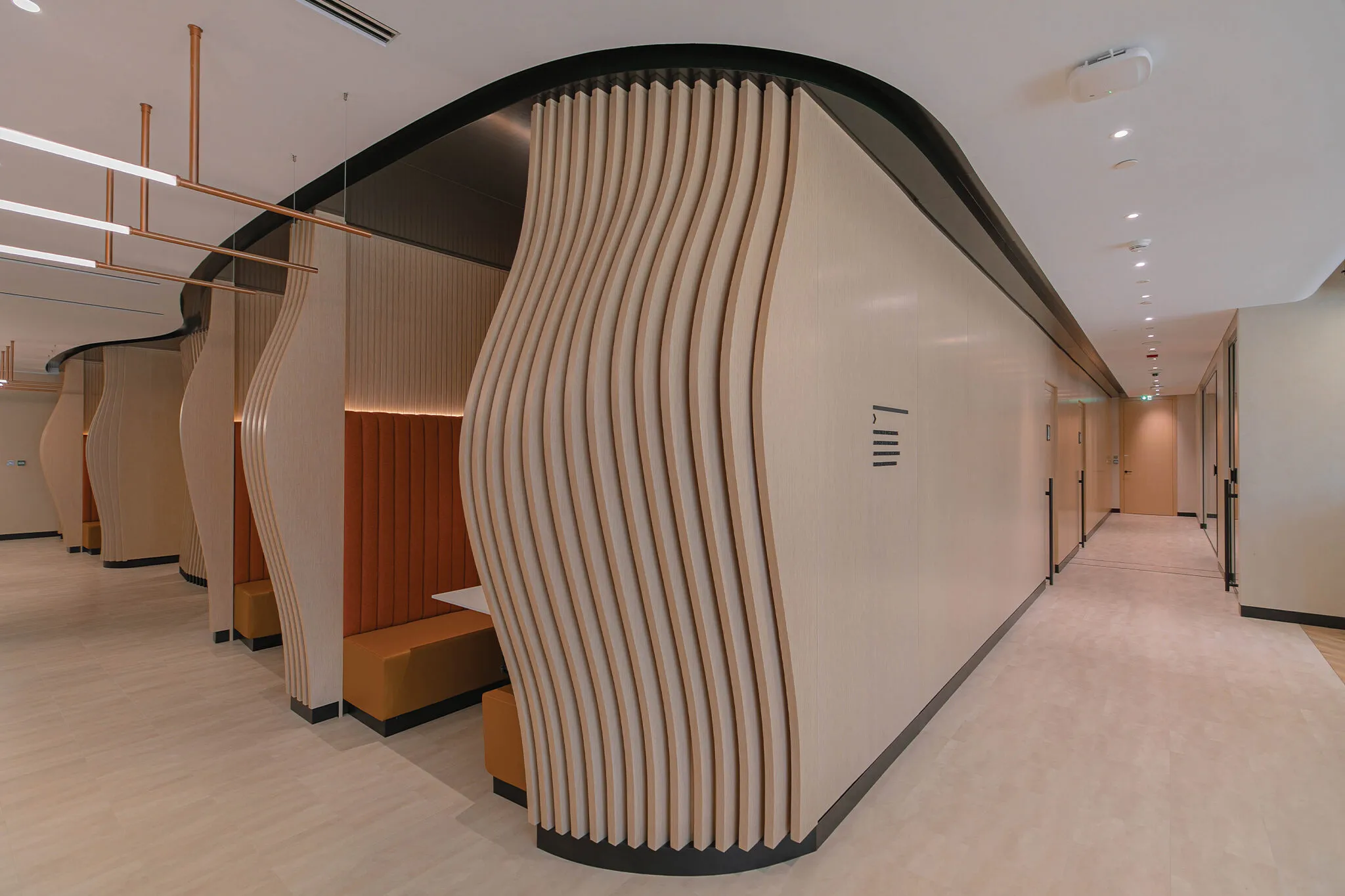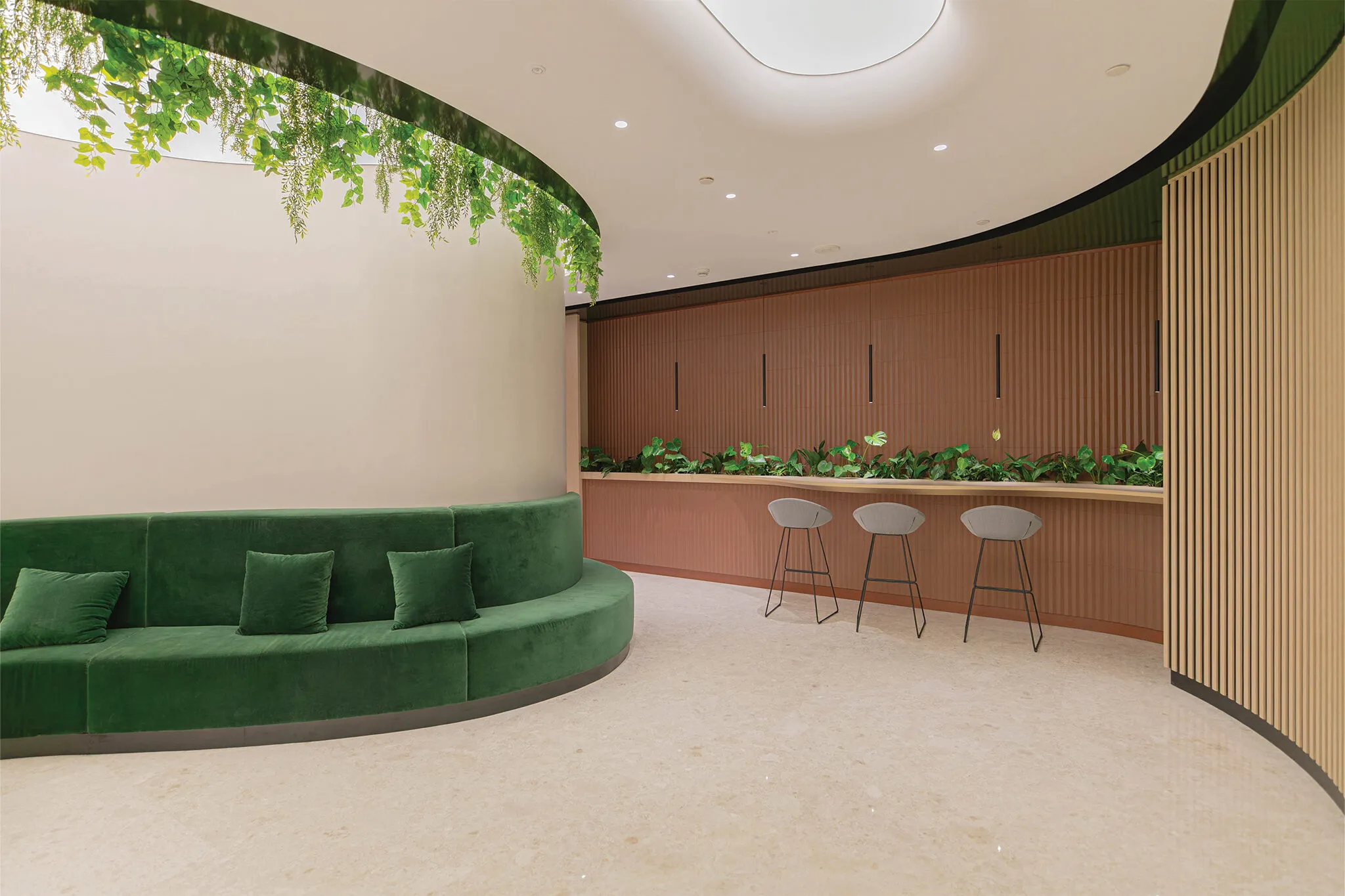 The pantry zone blends biophilic ceiling elements and vibrant tones with flowing timber slats that subtly divide space while softening acoustics. A social anchor point that balances function, wellbeing and visual warmth.